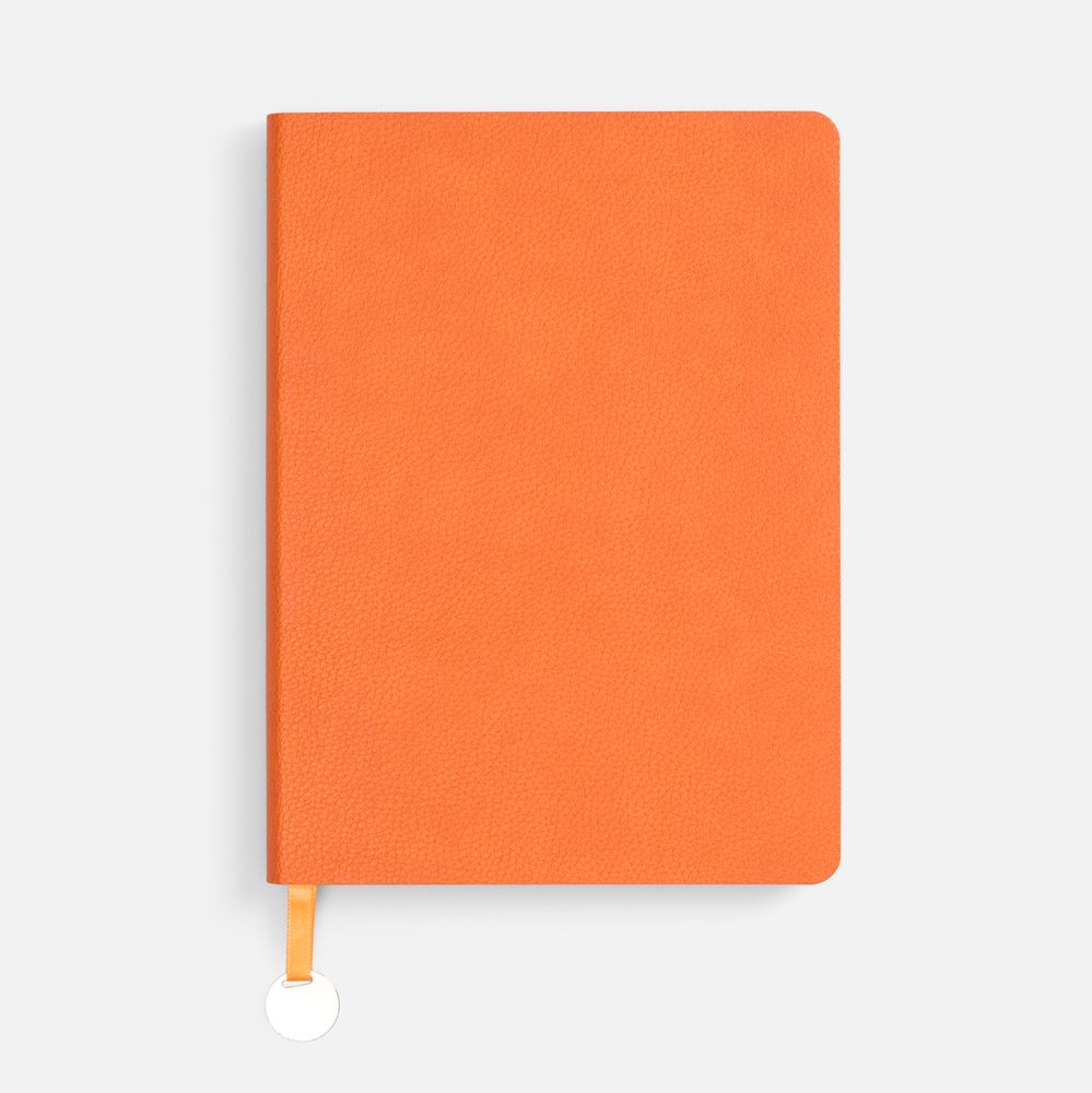 Ежедневник с гибкой обложкой, выполнен из материал La Fite, оранжевый ОО, дополнен ляссе в цвет обложки с металлическим шильдом.