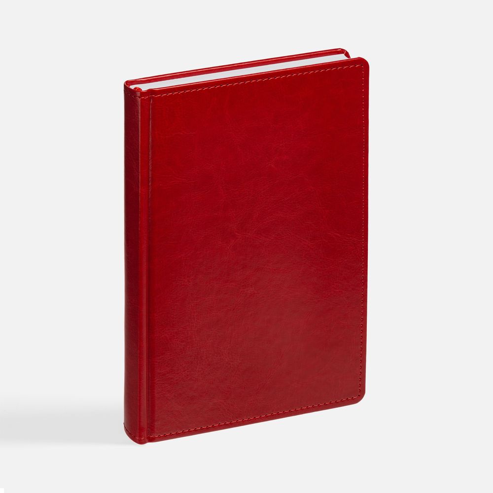 Ежедневник с твердой обложкой без поролона, выполнен из материала Nebraska, красный PP, дополнен ляссе и капталом в цвет обложки.