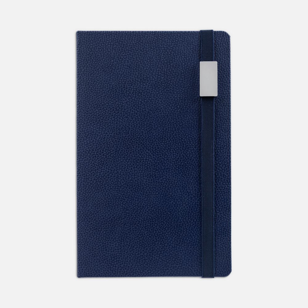 Ежедневник с твердой обложкой, выполнен из материала LaFite, темно-синий ХХ, дополнен резинкой с металлическим прямоугольным шильдом и ляссе в цвет обложки.