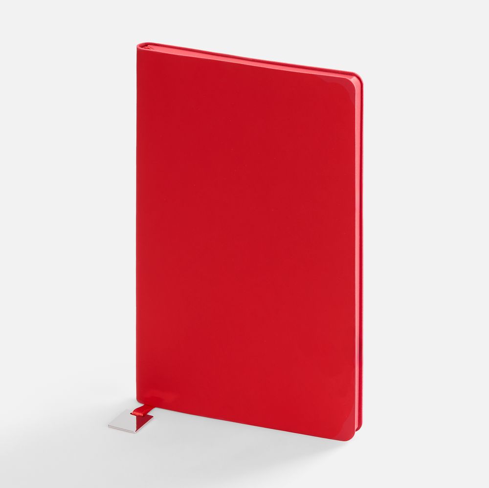 Ежедневник с гибкой обложкой, выполнен из материалов Soft Touch Ultra, красный РР, и Latte, красный (внутренняя часть обложки), дополнен ляссе в цвет обложки с металлическим шильдиком.