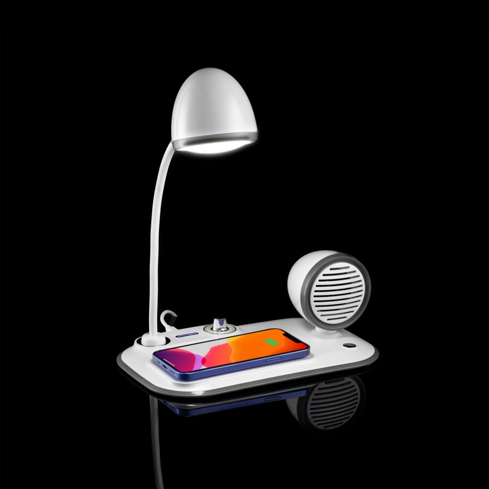 Лампа с колонкой и беспроводной зарядкой Flashback, белая – описание