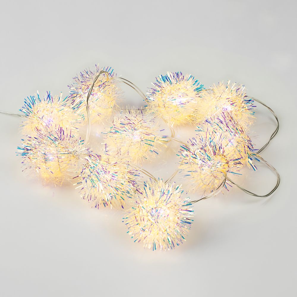 10 помпонов с мишурой с лампочками теплого света. Работает от 2 батареек АА (в комплект не входят).