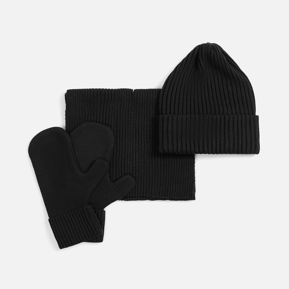 В набор входят удобный шарф с технологичным отверстием для быстрого завязывания, шапка с двойным отворотом и теплые двухслойные варежки с широкой манжетой. Все изделия связаны из акриловой пряжи, отличаются практичностью и элегантной простотой.
