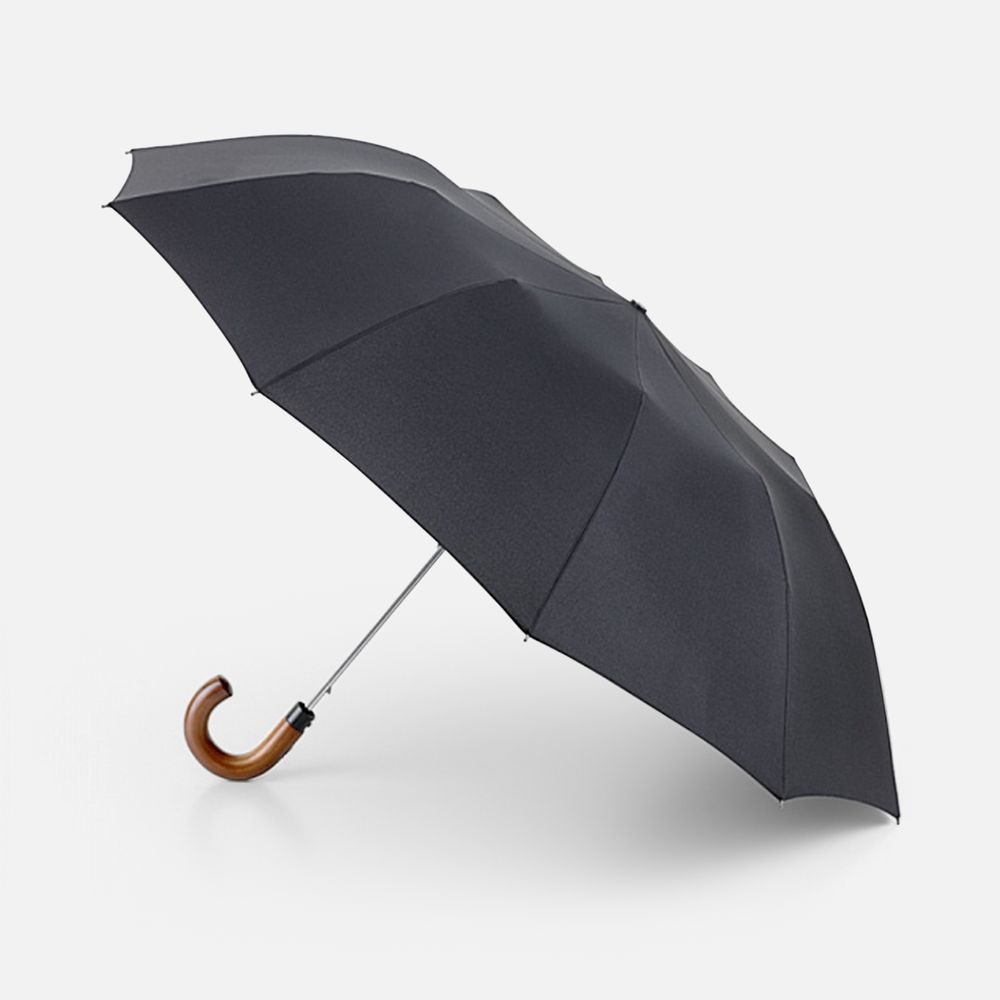 Идеальная модель для тех, кто не задается целью найти легкий и короткий складной зонт-«механику», а скорее, обрадуется старому доброму увесистому и основательному полуавтомату. У модели ветроустойчивая конструкция. Рукоять выполнена из массива дерева и благодаря натуральности материала невероятно комфортно ощущается в руке.